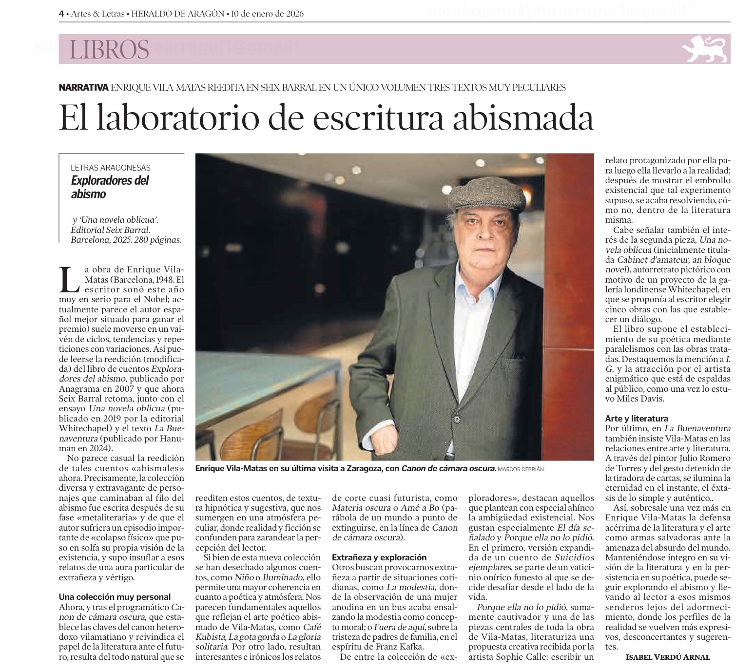 - Verdú, Isabel. EL LABORATORIO DE ESCRITURA ABISMADA. Heraldo de Aragón. Zaragoza. 10/01/2026.