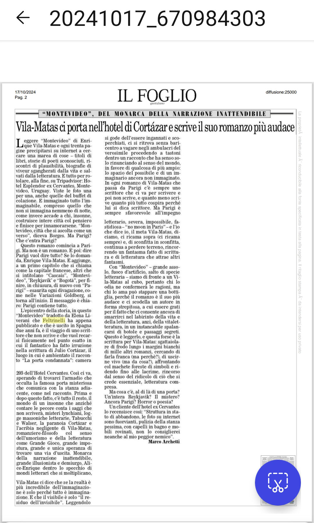 - Archetti, Marco. Il nuovo gioco di specchi di Vila-Matas al luna park della letteratura. Il Foglio (Italia). 27/10/2022.